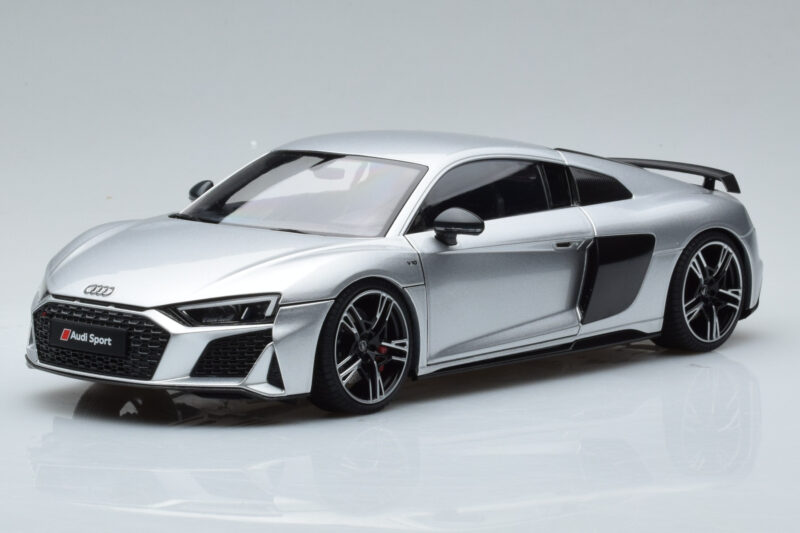 A 1:18 scale model measures approximately 25-28 cm (approximately 10-11 inches). The Audi R8 Performance Argintiu Kengfai 1:18 is perfect for display in a glass cabinet or on a shelf.