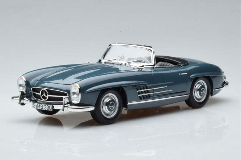 The Mercedes 300 SL W198 Roadster Albastru Norev 1:18 is crafted from Metal. Die-cast zinc alloy body with detailed plastic parts, rubber tires, and high-quality paint finish. Die-cast models are known for their weight, durability, and realistic feel.