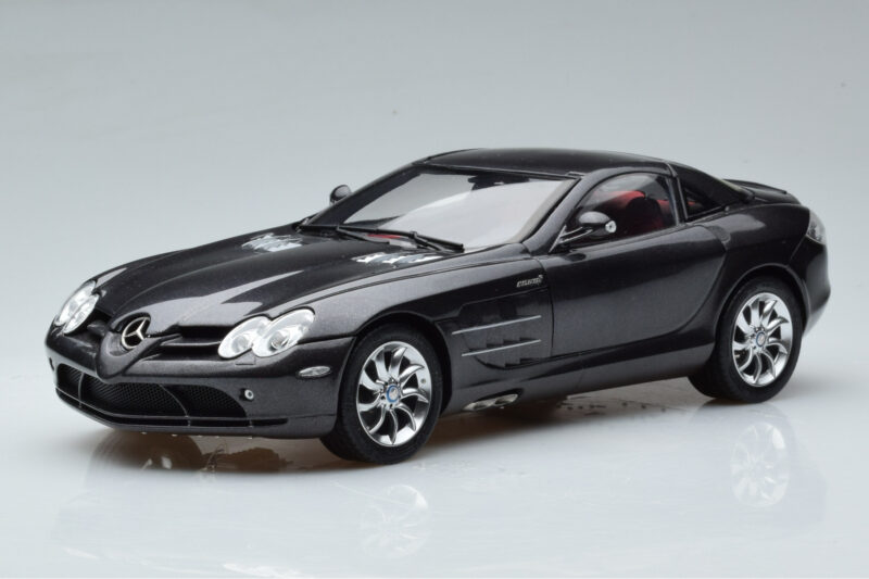 The Mercedes SLR McLaren Negru CMC 1:18 is crafted from Metal. Die-cast zinc alloy body with detailed plastic parts, rubber tires, and high-quality paint finish. Die-cast models are known for their weight, durability, and realistic feel.