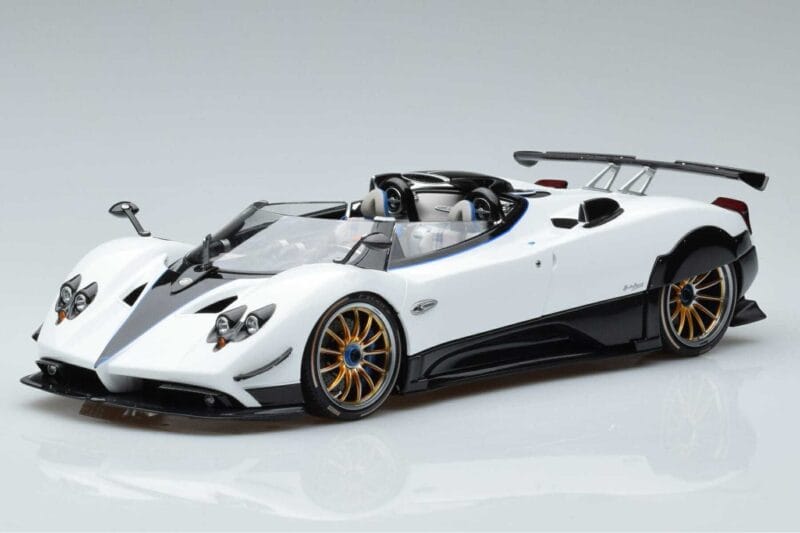 The Pagani Zonda HP Barchetta Carbon Fiber Alb LCD 1:18 is crafted from Metal. Die-cast zinc alloy body with detailed plastic parts, rubber tires, and high-quality paint finish. Die-cast models are known for their weight, durability, and realistic feel.