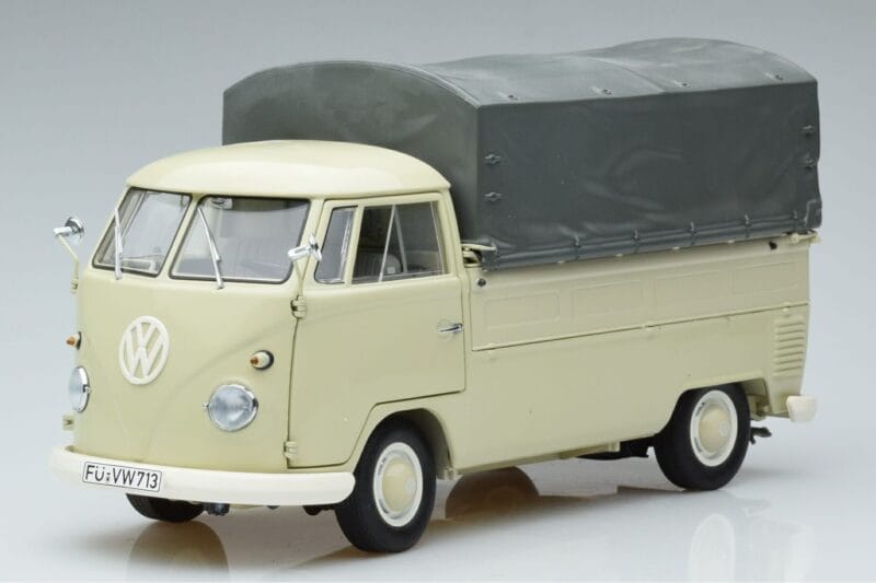 The Volkswagen T1b Pickup Schuco 1:18 is crafted from Metal. Die-cast zinc alloy body with detailed plastic parts, rubber tires, and high-quality paint finish. Die-cast models are known for their weight, durability, and realistic feel.