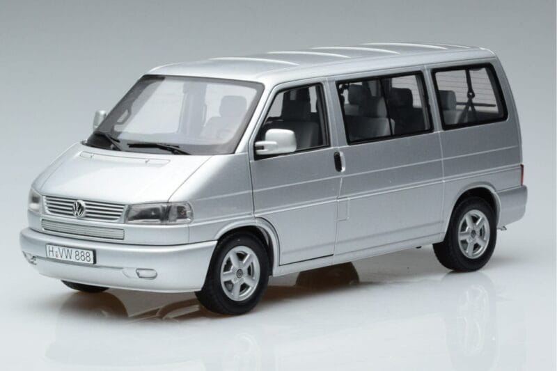 The Volkswagen T4b Transporter Caravelle Minibus Schuco 1:18 is crafted from Metal. Die-cast zinc alloy body with detailed plastic parts, rubber tires, and high-quality paint finish. Die-cast models are known for their weight, durability, and realistic feel.